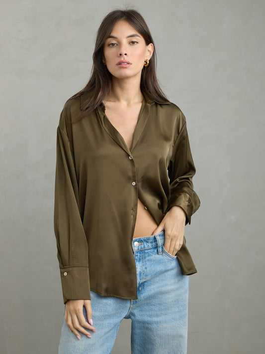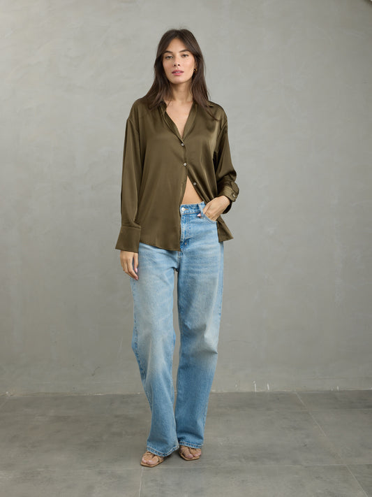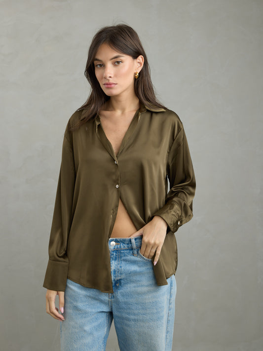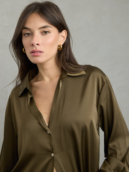 חולצה מכופתרת סאטן דונה | חאקי