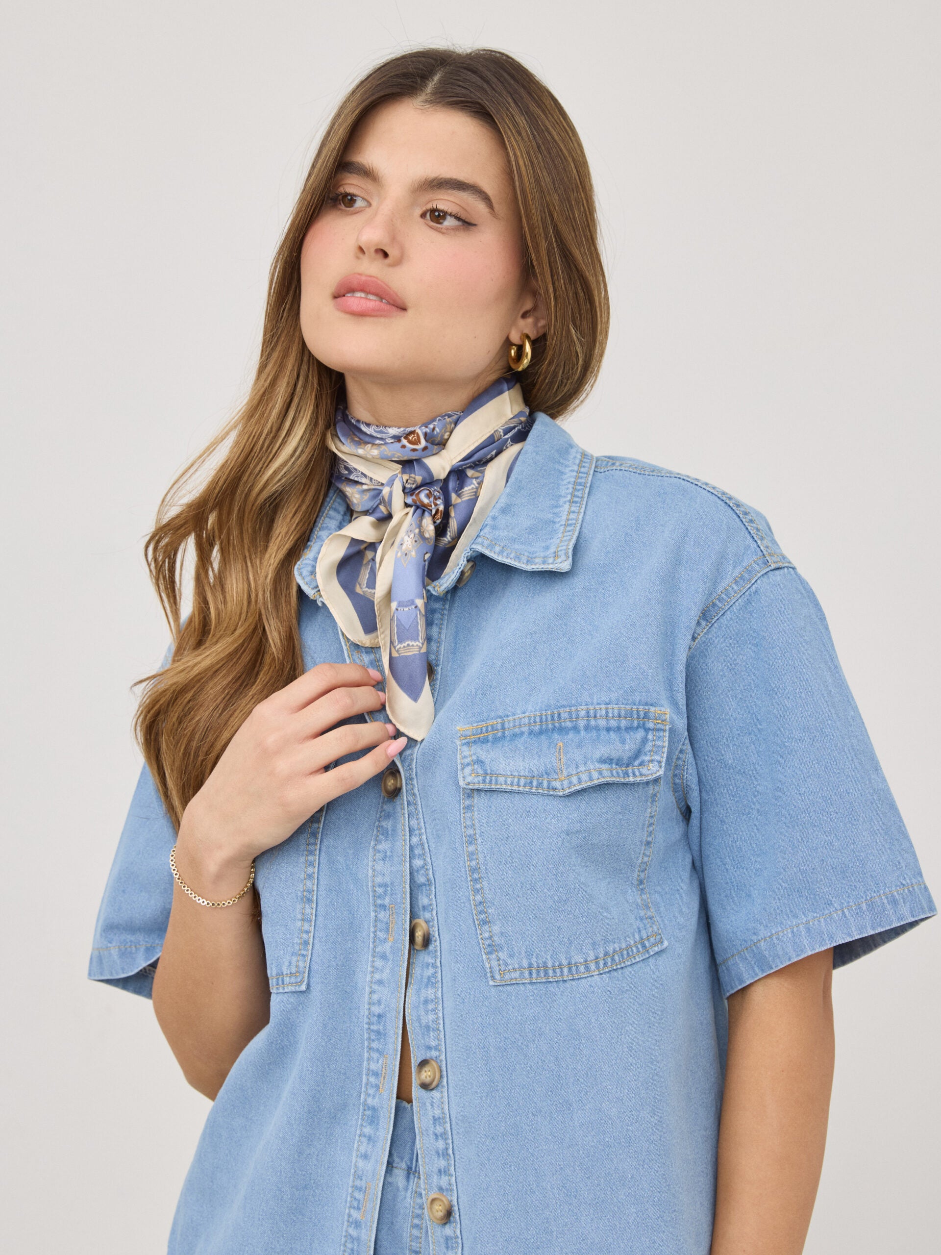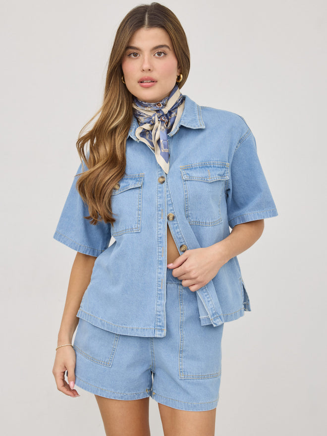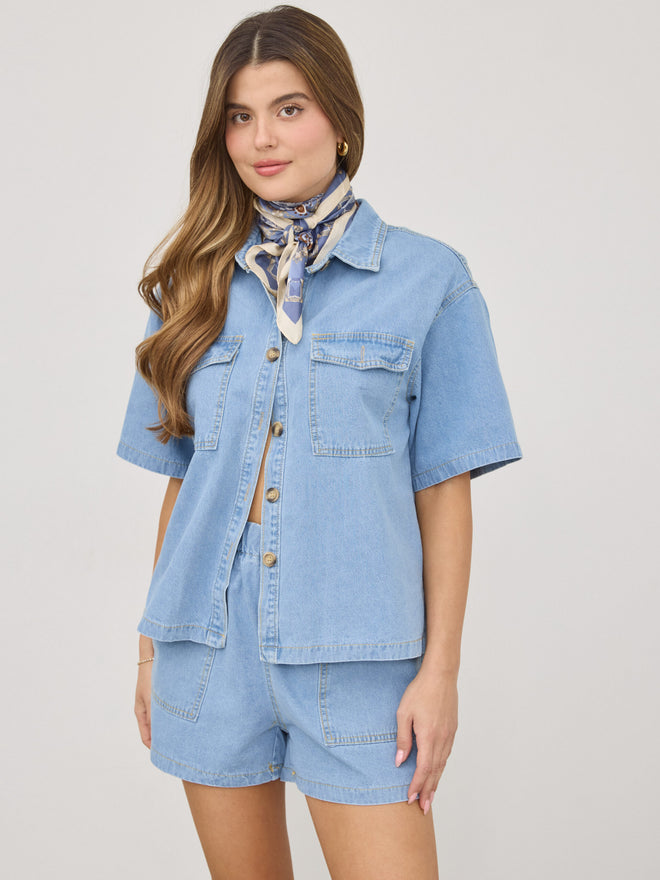 חולצה מכופתרת ג'ינס שרוול קצר בלייר | תכלת